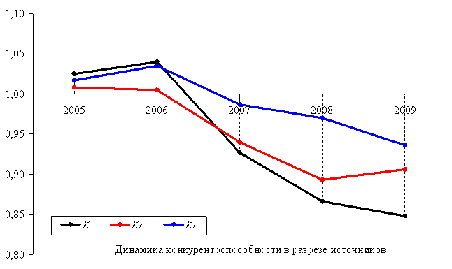 может быть охарактеризована как весьма низкая и имеющая ярко выраженную тенденцию к снижению. Падение уровня конкурентоспособности ООО ТГ «Альянс» в период с 2007 по 2009 гг. является следствием отрицательной динамики по обоим источникам конкурентоспособности. При этом, особую обеспокоенность вызывает крайне низкий уровень операционной эффективности ООО ТГ "Альянс".