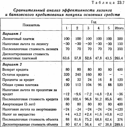 Как видно из табл. 23.7, более выгодным является .лизинг оборудования, так как он позволяет снизить его стоимость на 24,2 млн руб. (289,6-265,4).