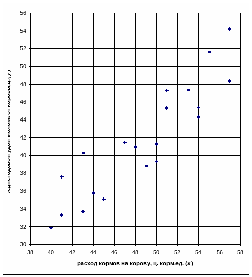 корреляционный анализ, при котором: будет определено влияние уровня кормления коров на продуктивность, изображена на графике зависи-мость среднего удоя молока от расхода кормов на 1 корову в год, построено уравнение регрессии, рассчитан и оценен коэффициент корреляции;