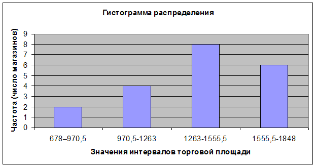 Вывод: из гистограммы наглядно видно, что магазины с торговой площадью от 1263 до 1555,5 кв. метров встречаются в исследуемой совокупности наиболее часто.