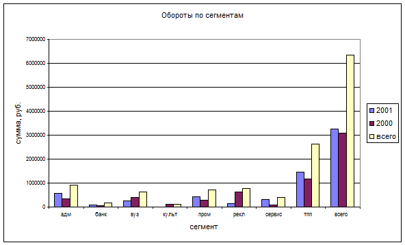 Рис.1.Динамика объема продаж ООО “Люкс” по целевым группам потребителей за 2000-2001гг.