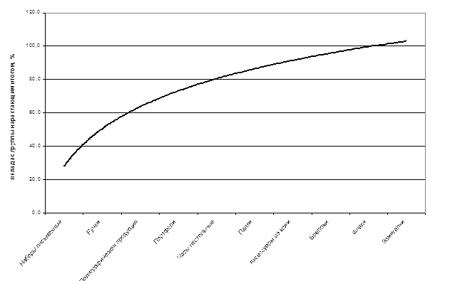 Рис.3.. Кривая анализа АВС. Объем продаж основных ассортиментных групп в 2001 г.