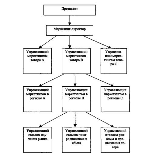 5.Комбинированная структура (рис.6) сочетает в себе две и более ориентации (функциональную, товарную, региональную, сегментную) в одной организационной структуре. Суть заключается в том, что в результате разумного объединения нескольких структурных систем можно добиться максимальной отдачи, которую дает каждая структура в отдельности.