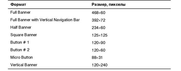 Существует единая классификационная система форматов рекламных баннеров, впервые сформированная InternetAdvertisingBureauвместе с CASIE(табл.1.).