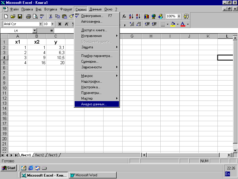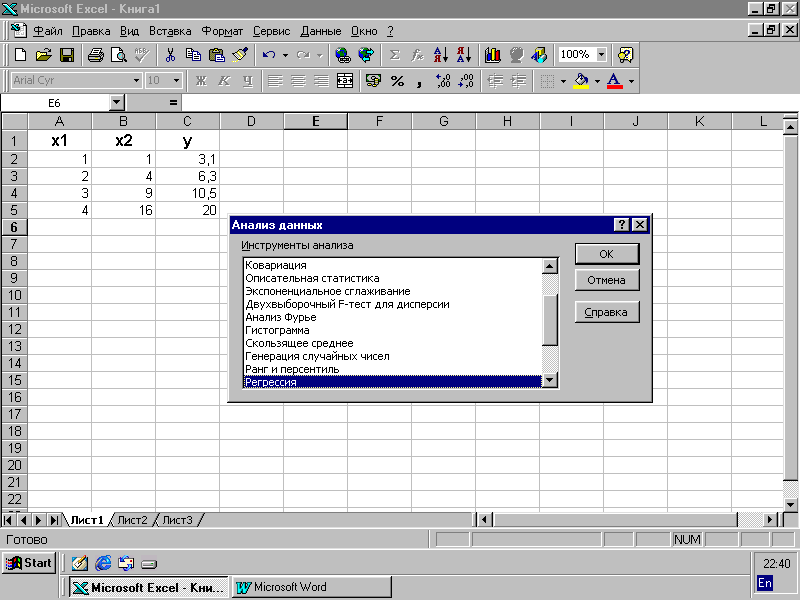 Исходные данные для программы «Регрессия» располагаются в виде столбцов. При этом в качестве значений элементов этих столбцов берутся числовые множители при неизвестных коэффициентов модели. Числовые множители при свободных членах не вводятся. Д ля работы с модулем «Регрессия» следует вызвать «Пакет анализа». Если этот пункт в данном меню «Сервис» отсутствует, необходимо его включить, используя пункт меню «Надстройка». Выделите в надстройках «Анализ данных», нажмите клавишу «ОК»