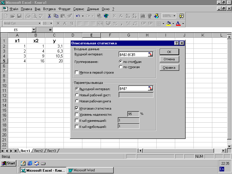 В результате Вы получите статистические показатели, такие, как среднее, дисперсия, среднее квадратичное отклонение и т.д. Обязательно определите Выходной интервал и Итоговую статистику.