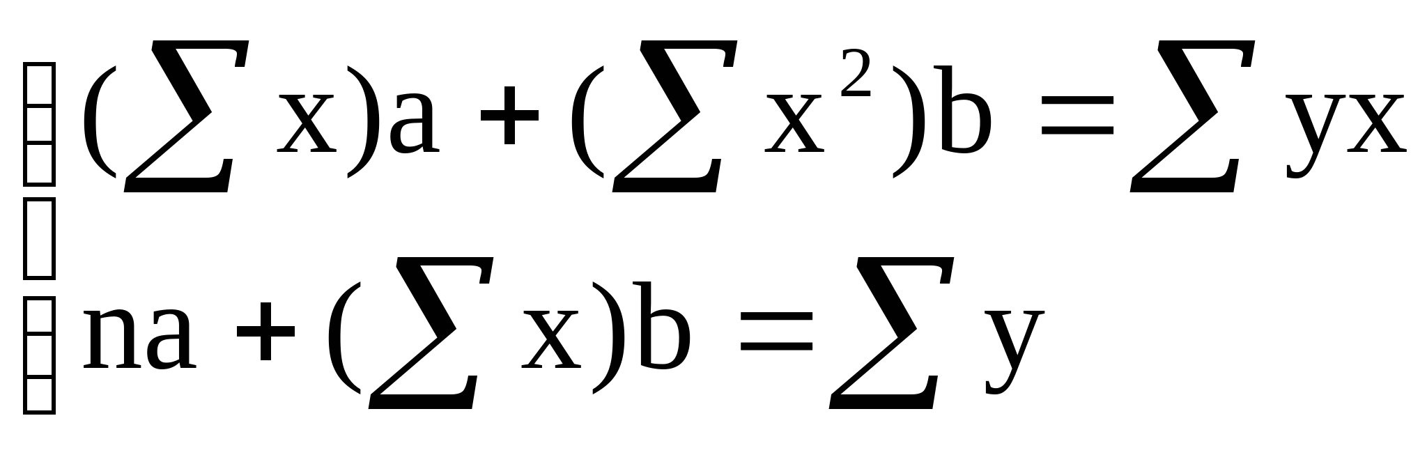 Найдем параметры a и b в результате решения системы нормальных уравнений, которая формируется на основе метода наименьших квадратов и имеет вид: (2)  суммирование ведется по n наблюдениям. В примере n=9. Расчет производных величин для определения параметров уравнения a и b, а также коэффициента корреляции проведем в таблице следующего вида: | n | y | x | yx | x2 | y2 |  | | 1 |
