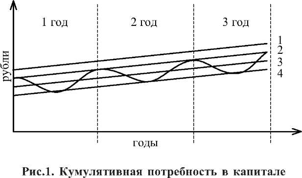 3. СТРУКТУРА КРАТКОСРОЧНОЙ И ДОЛГОСРОЧНОЙ ЗАДОЛЖЕННОСТИ Цель занятий: обоснование выбора доли долгосрочной и краткос- рочной задолженности для финансирования оборотных средств. 3.1. Взаимосвязь долгосрочных и краткосрочных финансовых решений Компании, осуществляющие инвестиционные решения, наращива- ют капитал. Совокупные затраты компании в активы называют кумуля- тивной (нарастающей) потребностью в капитале.  На рис.1 кумулятивная потребность в капитале представлена вол- нообразной линией. При наличии сезонных колебаний, в случае, представленном на рис. 1, компании в конце отчетного года испытывают наивысшие потребности в денежных средствах. Часто возникают и незаплани- рованные, непредсказуемые колебания потребности в капитале. Кумулятивная потребность в капитале может быть удовлетворена за счет долгосрочных и краткосрочных источников финансирования. Если долгосрочное финансирование не покрывает всех потребнос- тей в капитале, то ее удовлетворяют за счет краткосрочного финан- сирования. На рис.1 потребность в краткосрочном финансировании представлена как разность между объемом долгосрочного финанси- рования (прямые 1, 2, 3, 4) и кумулятивной потребностью в капита- ле. Когда долгосрочное финансирование соответствует прямым 1 и 27