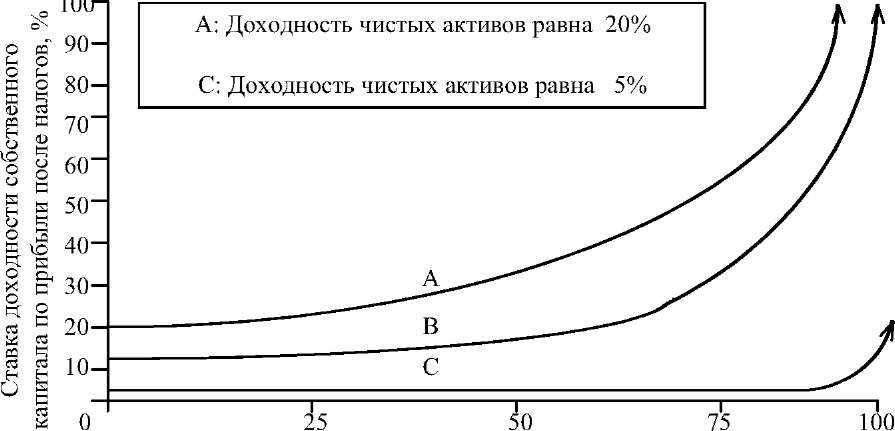 ного и собственного капитала, умноженным на разность между при- быльностью от чистых активов и стоимостью уплаченных процентов по кредитам с учетом налогов. Таким образом, из-за наличия долга в структуре капитала доходность собственного капитала ускоренно рас- тет, пока стоимость уплаченных процентов не превысит прибыль. Иногда соотношение между заемными и собственными средствами называют плечом финансового рычага, а разницу между доходностью чистых ак- тивов и стоимостью кредита - дифференциалом финансового рычага. Произведение этих величин характеризует уровень эффекта финансо- вого рычага, который прибавляют к ставке доходности чистых активов, чтобы получить значение доходности собственного капитала. Воздействие рычага на ставку доходности собственного капитала при трех различных значениях доходности чистых активов показывает рис. 7. Все три кривые построены в предположении, что стоимость заемного капитала составляет 4% годовых после уплаты налога [(1 - ставка нало- га на прибыль) X средний процент по займам]. Если нормальная ставка доходности капитализации фирмы по прибыли после уплаты налогов и до выплаты процентов составляет 20%, растущая доля долга вызовет впечатляющий рост доходности собственного капитала. Доходность под- скочит до бесконечно большой величины, когда доля долга приблизит- ся к 100%. Кривые В и С показывают эффект рычага при более скром- ных прибылях.  Доля задолженности в капитализации Рис. 7. Связь ставки доходности и доли заемного капитала 85