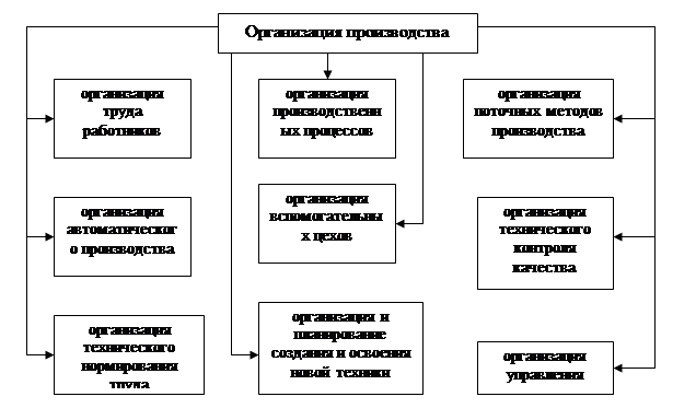 Под организацией производства понимается определённая организация сочетания и соединения основных элементов производства (труда, средств и предметов труда) в пространстве и во времени, а также их структурное соотношение.