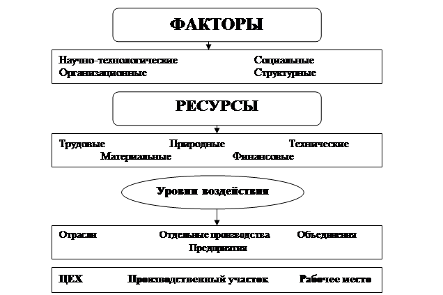 Рис.2 Взаимосвязь факторов эффективности труда с используемыми ресурсами и уровнями воздействия на организацию производства.