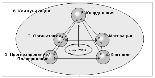 Кроме того, необходимо выделить шестую функцию менеджмента, позволяющую рассматривать первые пять как единую систему. Эта функция–