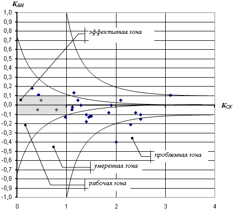 ), определяется степень возможности улучшений по исследуемому показателю. Выделяем четыре зоны анализа:
