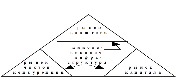 В условиях рынка как системы экон отношений купли-продажи тов в рамках кот формируется спрос, предложение и цена, основными компонентами инновационной деятельности выступают новшества инвестиции и нововведения. Новшества формируют рынок новшеств (новаций); инвестиции- рынок капитала (инвестиций); инновации- рынок чистой конкуренции нововведений. Эти 3 основных компонента образуют сферу инновационной деятельности. Графически схему можно представить в виде: