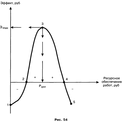 Предположим, что ресурсное обеспечение работ необдуманно увеличивается. Очевидно, что в этой ситуации будет возрастать и расходная часть бюджета фирмы, а прибыль будет уменьшаться Эффективность ее деятельности уменьшается (точка 4) и в какой-то момент становится отрицательной (точка 5).