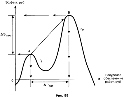 ), фирма решает увеличить объемы производства (рост потребностей на рынке стимулирует этот процесс). Очевидно, ей требуются дополнительные ресурсы, что может привести к снижению эффекта на прошлогодней оптимизационной кривой. Поэтому фирма планирует предпринять ряд качественно-новых организационных и технологических изменений, позволяющих сместить максимум оптимизационной кривой вправо вверх (t2