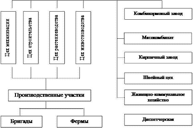 Организационная структура управления СПК «Обухово» представлена в Приложении 1. Как можно отметить в состав СПК «Обухово» входят не только цеха основного производства продукции растениеводства и животноводства, но также имеются и подсобные производства. Так в хозяйстве имеется кирпичный и комбикормовый заводы, мясокомбинат и швейный цех.