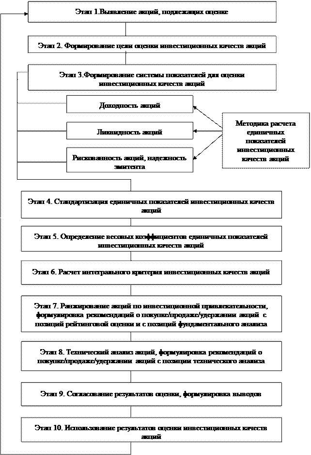 Из алгоритма оценки инвестиционных качеств акций (рис.1) следует, что оценка инвестиционных качеств акций – итеративно осуществляемая циклическая функция, предполагающая постоянный возврат к этапу выявления акций, подлежащих оценке с последующим прохождением полного цикла предусмотренных алгоритмом работ.