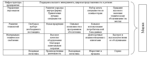 В таблице 2 приведена цепочка ценностей ООО «Восток - Л», из данных которой видно, что достижение прибыльности работы предприятия ООО «Восток - Л» обеспечивается развитостью инфраструктуры, эффективной организацией логистических процессов, обеспечением высокого качества продукции, постоянным расширением ассортимента предлагаемой продукции, быстрым о высококачественным обслуживанием заказчиков.