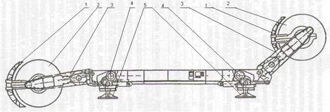 Комбайн скомпонован из двух шнековых исполнительных органов 2, разнесенных по концам корпуса, на регулируемых гидродомкратами поворотных рукоятях (3), которые состоят из редуктора и поперечно расположенного электродвигателя. В корпусе комбайна на раме устанавливаются и закрепляются электроблок, насосная установка с электродвигателем и два механизма подачи (4) с электроприводом. Гидродомкраты подъема поворотных рукоятей размещены с завальной стороны под корпусами механизмов подачи. На корпусе устанавливаются ограждение от падающих кусков. Для разрушения крупных кусков возможно применение дробилки. Комбайн оснащается вращающимися погрузочными щитками (1) с приводом от гидромоторов, размещенных в поворотных рукоятях. Перемещение комбайна осуществляется посредством бесцепной системы подачи. Корпус комбайна расположен над конвейером и жостко с ним связан завальными опорами. Забойные лыжи (5) нерегулируемые. Управление комбайном ручное, дистанционное или автоматическое, осуществляется системой MICOS-68. Комбайн может работать по двухсторонней или односторонней схеме совместно с механизированной крепью и скребковым конвейером.