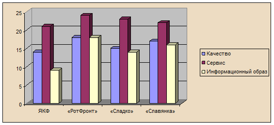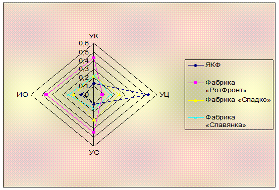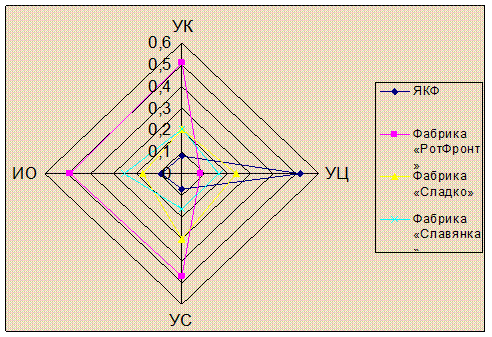 Из графика видно, что конкурентоспособность нашей фабрики очень мала, т.к. она не уделяет должного внимания информационному образу и не меняет ассортимент в соответствии с требованием рынка. Если Ярославская кондитерская фабрика не поменяет тактику на более мобильную, то она в ближайшее время, не выдержав конкуренции, может исчезнуть с рынка.
