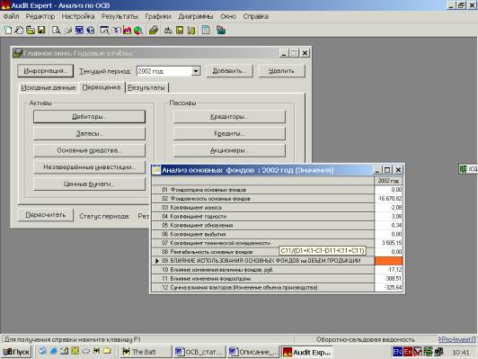 Также в Audit Expert рассчитываются показатели, позволяющие выявлять динамику основных средств (фондов), технического перевооружения и реконструкции предприятия, эффективности использования производственных мощностей и основных производственных фондов. Это показатели фондоотдачи и фондоемкости, рентабельности основных фондов, коэффициенты износа, годности, обновления, выбытия основных фондов предприятия, технической оснащенности (рис.1).