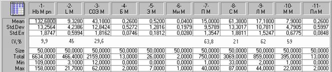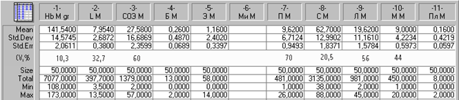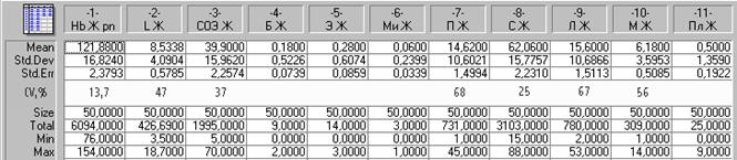 Средние значения гемоглобина 132 1,49 г/л у женщин и 141 2,06 г/л у мужчин (коэффициенты вариации от 7-10%) - в пределах среднестатистических норм, Количество лейкоцитов от 7,5 0,49 у женщин и 7,9 0,38 у мужчин - незначительно повышены, если учитывать нормы сибирского региона 3-6 тыс. Средний показатель СОЭ 24,8 1,75 мм у женщин и 27,5 2,35 мм у мужчин относительно повышен. В лейкоцитарной формуле проявляется тенденция к палочкоядерному сдвигу нейтрофильной популяции лейкоцитов (от 9,5 0,85 % у женщин и 9,6 0,4% у мужчин, причем коэффициент вариации очень большой. Средние значения лимфоцитов снижены и варьируют от 52 до 56%. Среднее количество эозинофилов и у мужчин и у женщин в пределах нормы.