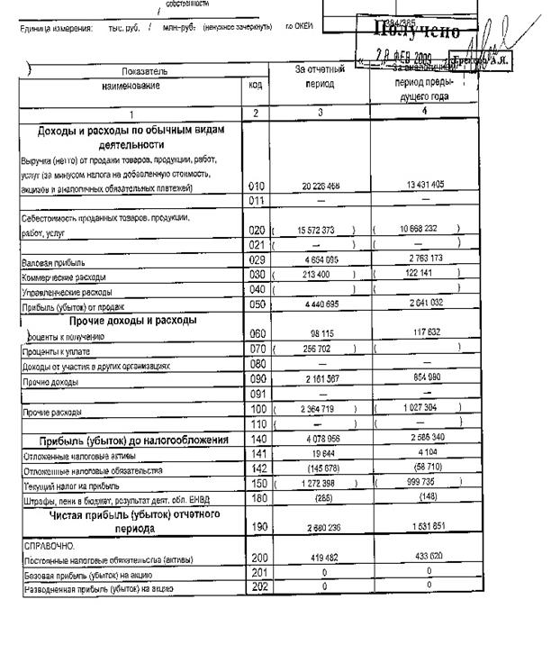Отчет о прибылях и убытках (форма №2) 2009 год
