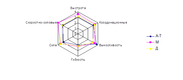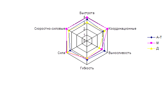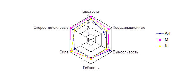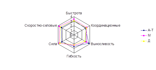 Рис. 3. Особенности структуры моторики школьников 16 лет разных типов телосложения