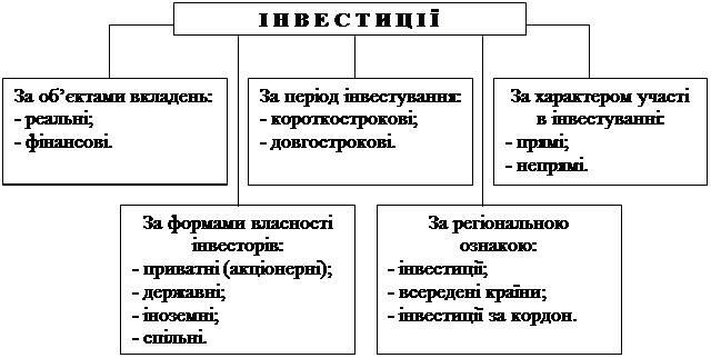 Схема 1 . Класифікація інвестицій за різними ознаками.