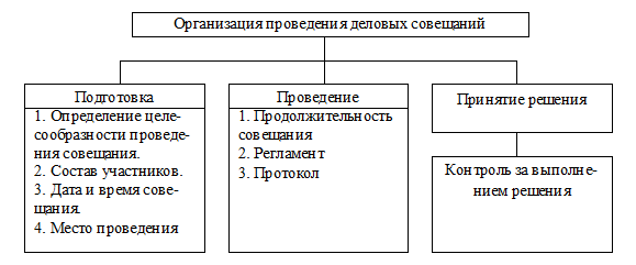 носят регулярный характер – один раз в месяц, неделю. Это позволяет правильно спланировать свое рабочее время и заранее подготовить выносимые на обсуждение вопросы.Технология организации деловых совещаний приведена на рис. 8.