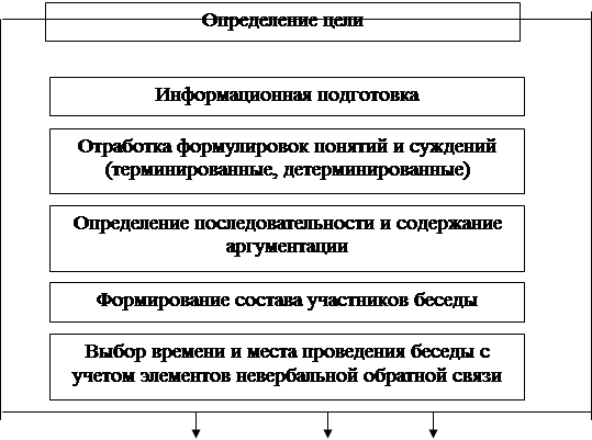 . Они имеют целью выработку тактики и стратегии, направлений деятельности по решению вновь возникающих производственных задач. Если на производственное совещание выносятся заранее подготовленные вопросы, то здесь большую роль играет неопределенность ситуации. Все сотрудники имеют (что объективно) различные точки зрения и соответственно заинтересованы в их продвижении. Это может служить началом «пограничной ситуации» конфликта. Поэтому на беседы приглашается как можно меньшее количество участников, т.е. сотрудников, которые имеют непосредственную заинтересованность в решении данных проблем. Насколько грамотно с этической стороны будет проведена беседа, настолько выше будет степень ее эффективности. Схематичное изображение правил подготовки и проведения деловой беседы приведено на рис. 20.