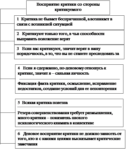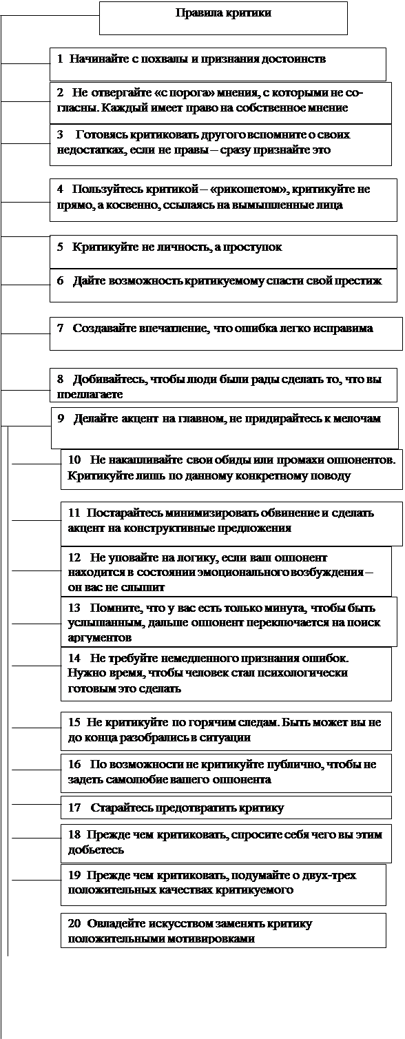 Особое место в этических взаимоотношениях руководителя и подчиненных занимают вопросы критики (поведения, действий, отношений и т.д.). Критика существующего положения является движителем прогресса для организации – это закон диалектики. Но это является и наиболее «щепетильным» вопросом во взаимоотношениях. Поэтому одним из основных коммуникационных умений руководителя является умение конструктивно критиковать своих коллег и подчиненных, не наживая «врагов», формируя благоприятную психологическую атмосферу в коллективе (рис. 21).