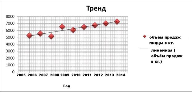 Прогнозирование объемов производства на 2011-2014 года с помощью Microsoft Exel и функции «ТЕНДЕНЦИЯ», где в качестве значений х – принимались значения года, у - объем продаж кг. (таблица 1)