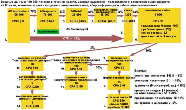 3. Исходя из данных веб-издателя мы знаем, что в среднем за эту неделю пользователи посещали сервер 3 раза (100 000 посещений, 33 000 уникальных пользователей). Следовательно, нашу рекламу пользователь в среднем видел 3 раза. Получаем, что Adfrequency = 3, а Adreach = 23 000 (кол-во уникальных пользователей, которым была показана реклама: 70000/3). Получается, что стоимость контакта с тысячью уникальных пользователей составила CPUU = $43,5, что на 8% меньше чем в среднем по всей рекламной кампании.