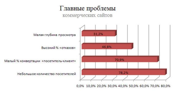 Согласно опросу, основные недостатки сайтов - небольшое количество посетителей (78,2%); малый % конвертации «посетитель-клиент» (70,9%); высокий % «отказов» , т.е. просмотра только одной страницы сайта (46,8%); малая глубина просмотра (31,2%). Если резюмировать сказанное, то главная проблема сайтов – низкое качество трафика и его неспособность «продать» товар, услугу или бренд компании.