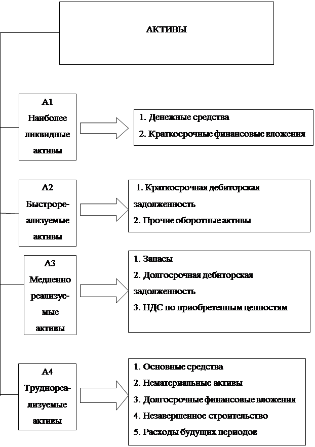 Ликвидность баланса – возможность актива обратиться в наличные средства и погашение платежных обязательств. Все активы в зависимости от степени ликвидности делятся на 4 группы (рис.1).