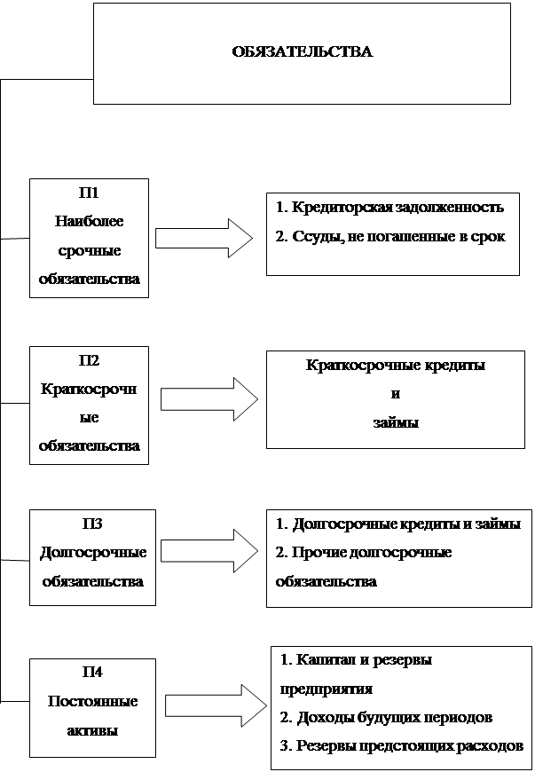 Обязательства предприятия также делятся на 4 группы (рис. 2). Анализ ликвидности баланса определяется следующим образом: средства по активу группируются по степени убывающей ликвидности и сравниваются с краткосрочными обязательствами по пассиву, сгруппированных по степени срочности их погашения (рис. 3).
