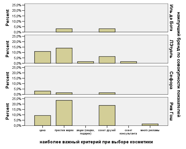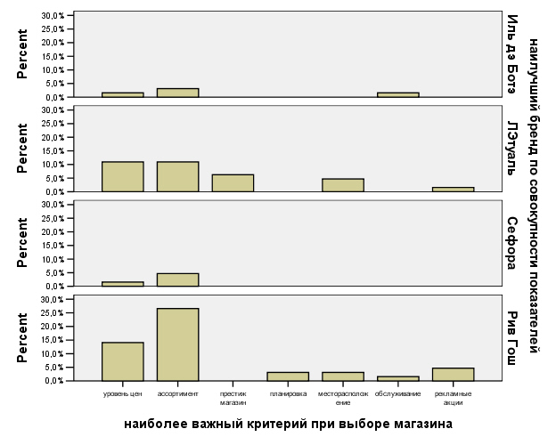 Исследование так же показало, что «Сефора» - как попытка бренда «ЛЭтуаль» захватить часть сегмента, занятого «Рив Гош», с точки зрения анализа данных анкетирования, не является удачной, т.к. «Рив Гош» все же превосходит «Сефора» по всем параметрам.