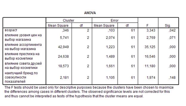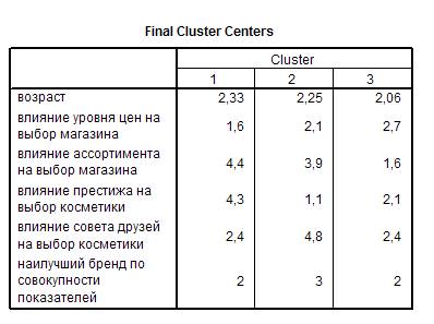 кластера наибольшее значение при выборе магазина имеет ассортимент и престиж марки при выборе косметики влияет на респондентов гораздо больше.