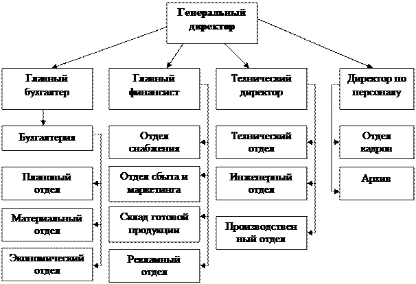 Итак, проанализируем организационную структуру предприятия ОАО «Мираж». Во главе структуры стоит генеральный директор, ему подчинены главный бухгалтер, главный финансист, технический директор, директор по персоналу. Главный бухгалтер курирует работу учета и отчетности на предприятии - отдела бухгалтерии, который в свою очередь делится на несколько подразделений – плановый отдел, материальный отдел и экономический отдел (данный отдел является самым большим, в его задачу входит начисление и выплата заработной платы, контроль за отчислением налогов и сдачи отчетности). Главный финансист руководит службой снабжения (работа с поставщиками), сбыта и маркетинга (оптовые и розничные клиенты и т.д.), складом (т.к. работа отдела снабжения и сбыта неразрывно связана с работой склада), и рекламный отдел, который занимается разработкой и внедрением новых продуктов на рынок, стимулированием рынка сбыта, привлечением потенциальных клиентов и т.д. Технический директор руководит техническим, инженерным и производственным отделом. Директор по персоналу – отделом кадров и архивом, в отдел кадров входит также служба делопроизводства.