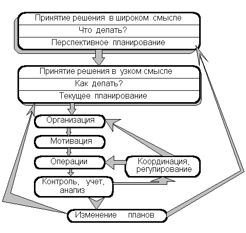 Наибольший интерес представляет процесс принятия и реализации решений как последовательная смена взаимоувязанных стадий, этапов различных действий руководителя, вскрывающая технологию мыслительных действий, поисков истины и анализа заблуждений, путей движения к цели и средств её достижения. Только такой подход позволяет понять зафиксированный акт управленческого решения, источники его происхождения.