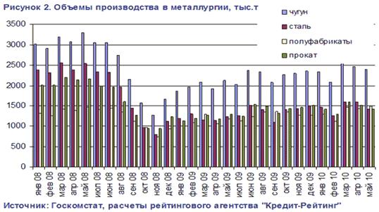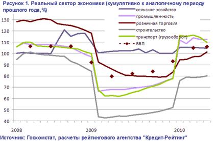 Как и в предыдущем месяце, наибольшее негативное влияние на динамику экономической активности в реальном секторе экономики будет оказывать сельское хозяйство. Как мы и предполагали ранее, в металлургии наблюдалось увеличение объемов производства, однако активность предприятий отрасли, по-прежнему, ограничивается сезонным внешним спросом, дефицитом оборотных средств, долгами за сырье и энергоносители, что не позволяет восстановить объемы деятельности на докризисном уровне. В дальнейшем, до конца 2010 года, мы ожидаем увеличения среднедневных объемов выплавки металлопродукции, однако темпы роста не достигнут докризисного уровня.