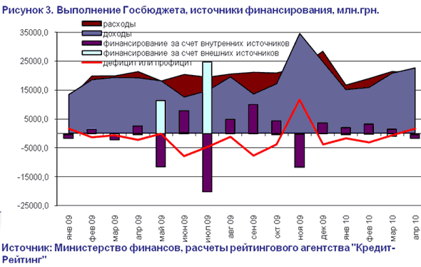Прирост доходной части Государственного бюджета не смог компенсировать возросшую нагрузку на расходную часть вследствие повышения социальных стандартов и, соответственно, увеличения расходов на финансирование бюджетной сферы и дефицита Пенсионного фонда. В результате дефицит Государственного бюджета по итогам четырех месяцев 2010 года составил 3,8 млрд.грн.