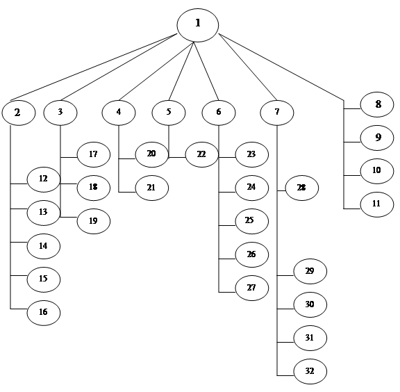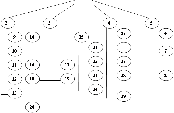 Граф G, соответствующий данному предприятию показан на рисунке 2, где цифры обозначают: 1 – директор предприятия; 2 – директор по общим вопросам; 3 – главный инженер; 4 –финансовый директор; 5 –отдел технического обеспечения; 6 – канцелярия; 7 –хозяйственный отдел; 8 –АСУП; 9 – отдел материально- технического снабжения; 10 – товарно- сырьевая база; 11 – ремонтно - строительный цех;12- транспортный цех; 13- отдел капитального строительства; 14- проектно- конструкторский отдел; 15- директор по основному производству; 16- отдел главного механика; 17- группа маркетинга; 18- отдел техники; 19- ремонтно- механический цех; 20- отдел главного энергетика; 21- цех №1;22- цех №2; 23-цех №3; 24- производственно- технический отдел; 25- бухгалтерия; 26- финансовый отдел; 27- плановый отдел; 28- отдел труда и заработной платы; 29- отдел кадров.