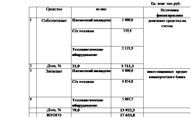 • модульный молочный завод "Молоконт" - 5039,6 тыс. руб. Количество, цены и общая стоимость животных приведены в Таблице 2. Сумма потребности в инвестициях составляет 13 922,5 тысяч рублей, из них будет профинансировано собственными средствами 3711,3 тысяч рублей (21%). За счет собственных средств будет оплачена стоимость животных и оборудования в размерах: