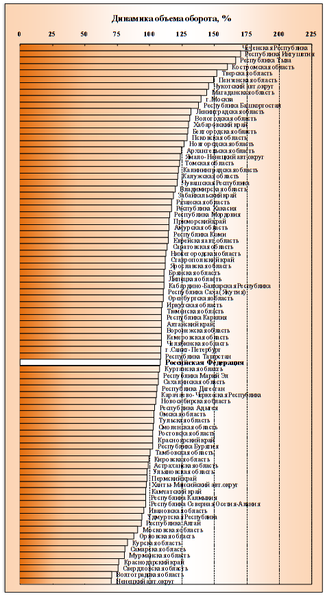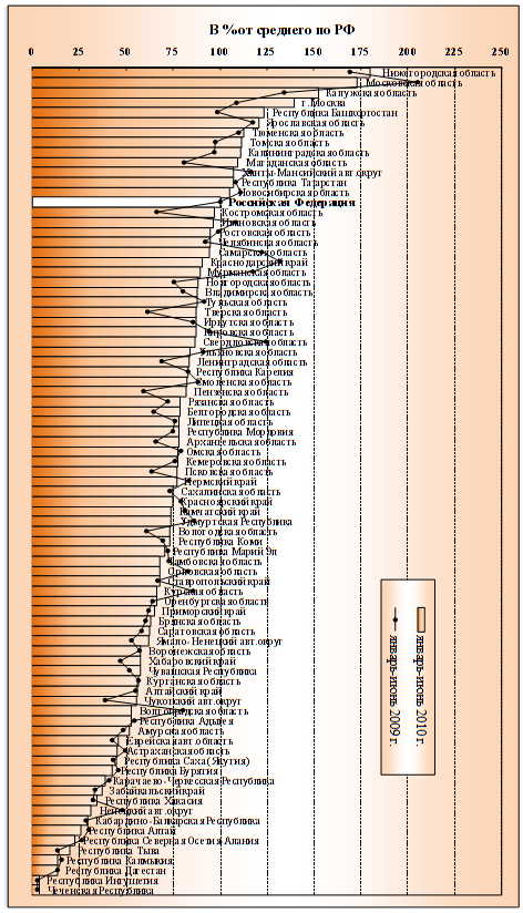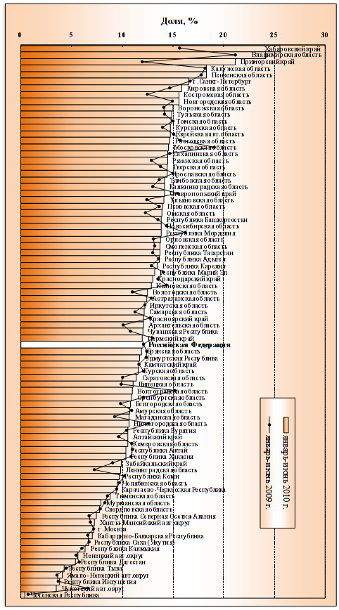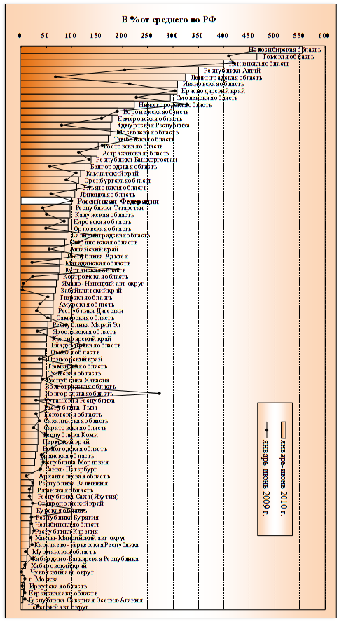 Для наглядности на рисунке не отображен г. Санкт-Петербург (значения показателя в январе-июне 2009 г. и январе-июне 2010 г. составили 299,1% и 303,3% соответственно).