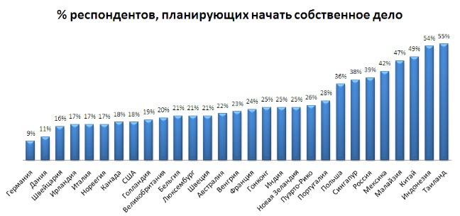 По числу желающих стать предпринимателями россияне далеко не лидеры (см. график). Больше всего желающих обзавестись своим делом в Таиланде (55%), Индонезии (54%) и Китае (49%). Меньше всего — в Германии (9%), Дании (11%), Швейцарии (16%), Ирландии, Италии и Норвегии (по 17%).