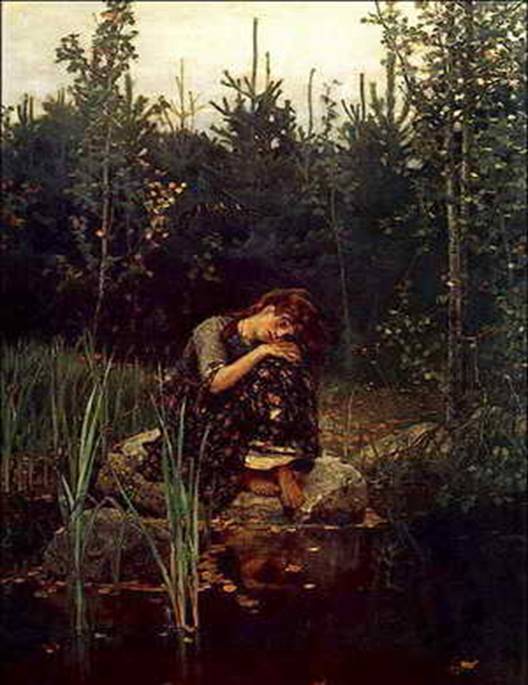 в которой отразил духовную связь человека и природы и обнаружил дарование тонкого пейзажиста. Знаменитая «Аленушка» принадлежит к числу самых проникновенных созданий художника. Никогда Васнецов не придерживался точного текстового содержания той или иной сказки или былины. Они всегда являлись только отдаленным первоисточником, отправной точкой для творческой фантазии художника, создававшего в удивительном соответствии с народной традицией свою собственную сказку, в которой все дышит подлинно народной поэзией. В «Аленушке» народная сказка как бы перевернута, в ней нет ни братца Иванушки, стоящего над омутом и обращенного в козленка, ни брошенной в воду с тяжким камнем на шее Аленушки, жалобно зовущей на помощь. Все здесь наоборот: на большом прибрежном камне в центре картины сидит, пригорюнившись, одинокая девушка-сиротка, васнецовская Аленушка, и оплакивает то ли братца Иванушку, которого погубили злые люди, то ли свою горемычную сиротскую долю. Поэтическое вдохновение Васнецова создало кристально чистый образ несчастной беспризорной девочки-сиротинушки, непостижимыми нитями связанной со многими тысячами таких же бездомных сироток, что бродили некогда по русской земле без ломтя хлеба за пазухой и знать не знали, ведать не ведали, где приклонить усталую головушку и размыкать горе и тоску. В Аленушке, в ее вызывающей безмерную жалость согбенной фигурке, в трогательной худобе и девической нескладности всего ее облика художник сумел выразить живописными средствами то, о чем на протяжении веков слагались не одна русская сказка, не одна народная песня. Талант Васнецова навсегда закрепил в нашем сознании этот скорбный образ одинокой, покинутой всеми близкими девушки, которая, притаясь в густой, непролазной чаще, тихо, беззвучно, у тихой лесной водицы, выплакивает свое горе от незаслуженных людских обид и скорбит о своей юной загубленной жизни, обернувшейся для нее суровой, несправедливой, злой мачехой. Прекрасно написан в картине пейзаж, не отделимый от образа Аленушки. И лесок, подступающий к берегу, и прибрежный тростник как бы разделяют Аленушкино горе, скорбят вместе с девушкой, укрывают ее от злых обидчиков. Надо было знать, понимать, любить родную природу так, как Васнецов, чтобы с подобной, подлинно магической силой воспроизвести ее настроения и слить их в единый эмоциональный аккорд. С несравненным совершенством художник выразил здесь связь переживаний человека и природы. «Как умно, тактично, не назойливо написан пейзаж в «Аленушке»! — заметил однажды советский художник В. Н. Яковлев.— Ни одна деталь не отвлекает зрителя от главного, и в то же время картину Васнецова можно рассматривать во всех деталях, находя все больший материал для размышлений, для раскрытия основного замысла художника. Одиноко тоскует Аленушка о пропавшем братце Иванушке. Глухо шумит обступивший девочку бор. Робко поджала она изрезанные осокой босые ноги, неласково встречает ее мачеха-осень... черная, глубокая стоит у берега холодная вода, и знобкий ветер срывает с багряных осин последние листья. Сиротлива и поза Аленушки, и низкое, серое, унылое небо, и ласточки, готовящиеся к отлету. Все сплетается в единую, глубоко продуманную, грустную мелодию, трогательную, как незатейливый напев пастушьей жалейки. И чем дольше вы смотрите на «Аленушку