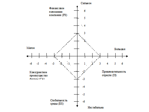 Одним из инструментов диагностики положения фирмы в рыночном "пространстве" является методика, которая в английской аббревиатуре так и называется SРАСЕ (пространство)=Stгаtеgiс Роsition аnd Aсtion Еvаluation (стратегическая оценка положений и действий). В основе методики лежит анализ положения фирмы и условий ее функционирования по четырем координатам: конкурентное преимущество фирмы, ее финансовое положение, привлекательность отрасли и, наконец, стабильность экономической среды.